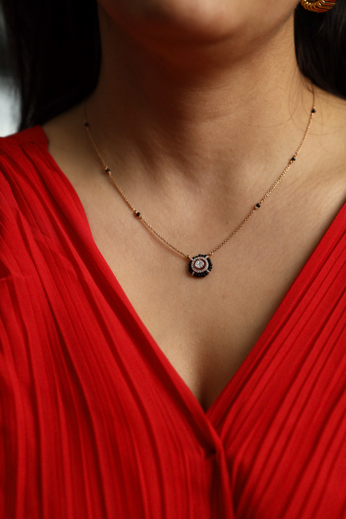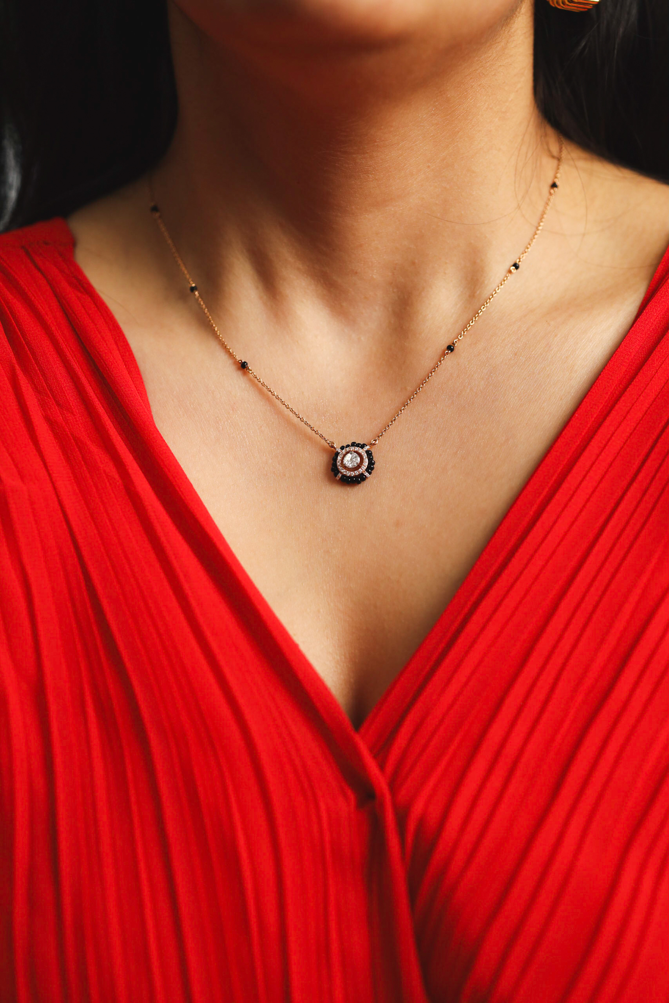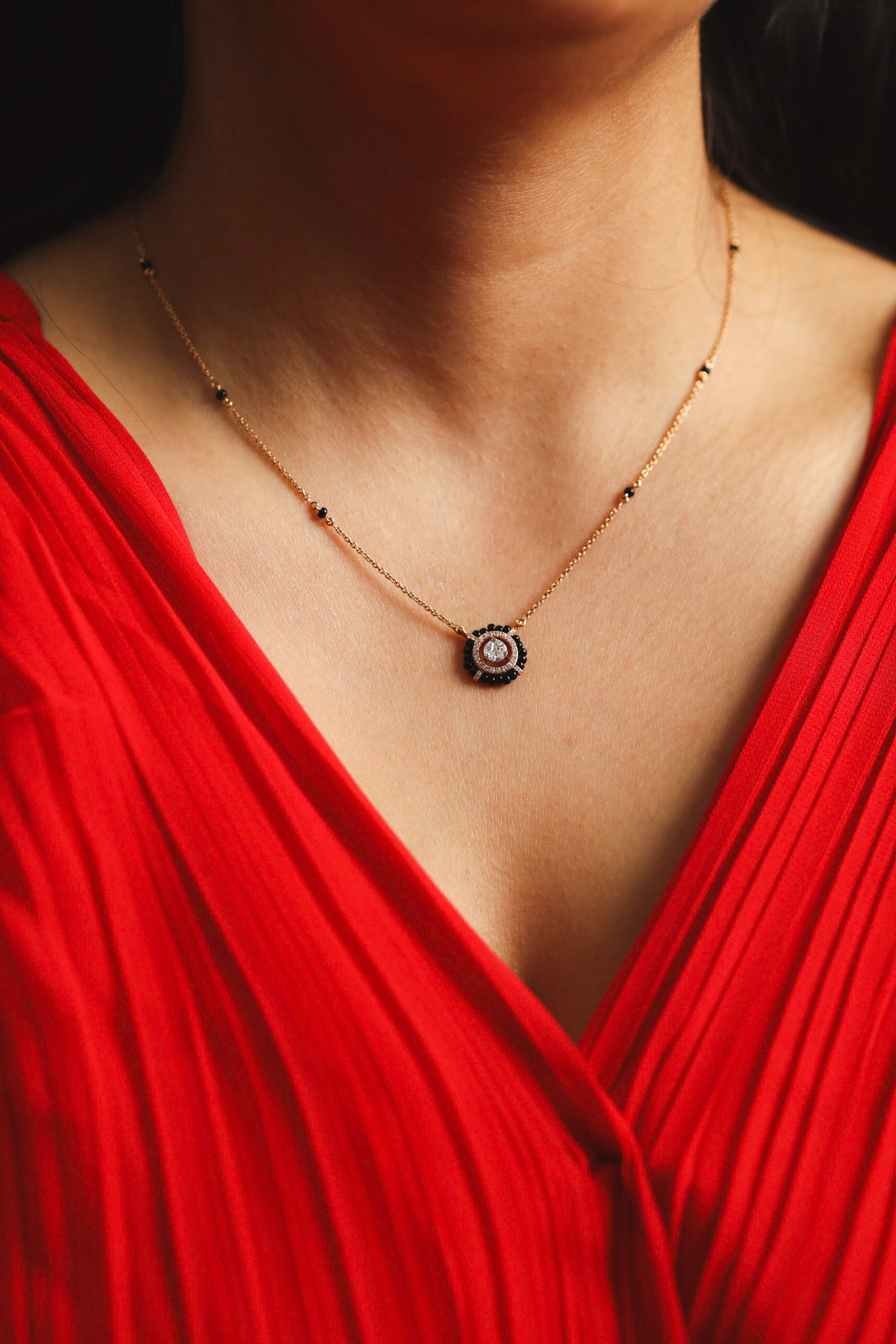Its central diamonds are encircled by black beads, symbolizing unity and wholeness, this pendant is a modern tribute to the timeless tradition of wearing mangalsutra, representing love and life’s continuity.